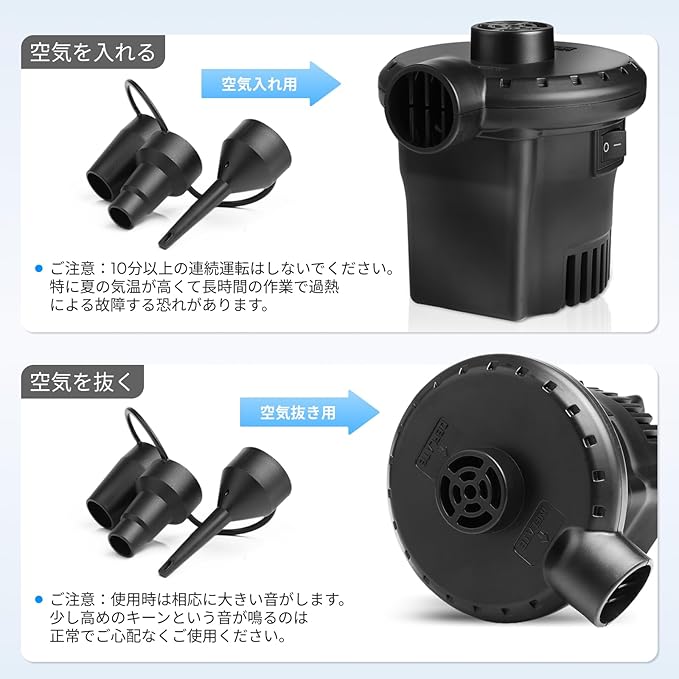 【使いかた】専用ノズル付きます。『空気を入れる』:1.空気を入れる側のパルプに合わせてノズルを選び、電動ポンプ本体の空気吹き出し口に専用ノズルを差し込む。2.電源プラグをコンセントに差し込む。 3.スイッチの「I」を押すと、操作が始まります。『空気を抜く』:1.空気を抜く側のパルプに合わせてノズルを選び、電動ポンプ本体の空気吸い込む口に専用ノズルを差し込む。2.電源プラグをコンセントに差し込む。 3.スイッチの「I」を押すと、操作が始まります。