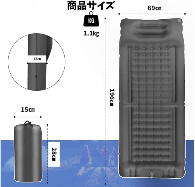 このエアーマットは、快適な睡眠体験を提供する革新的なアウトドアギアです。約196 68 13cmのゆったりとしたサイズで、地面の凹凸から体を守ります。人間工学に基づいて設計された内蔵エアピローは、首や頚椎をサポートし、自然な寝姿勢を保ちます。内蔵インフレーターポンプにより、30-60秒で簡単に膨らませることができ、別途ポンプを購入する必要はありません。40Dナイロン素材とTPU素材を組み合わせた防水構造で、耐久性も抜群です。両側の接続ボタンで複数のマットを連結可能で、最大耐荷重300kgまで対応。収納時は約15 15 35cmとコンパクトになり、付属の収納袋で持ち運びも便利です。キャンプ、車中泊、BBQなど、様々なアウトドアシーンで活躍します。特殊な二重バルブ設計により、空気漏れの心配もなく、夜通し快適な睡眠を楽しめます。