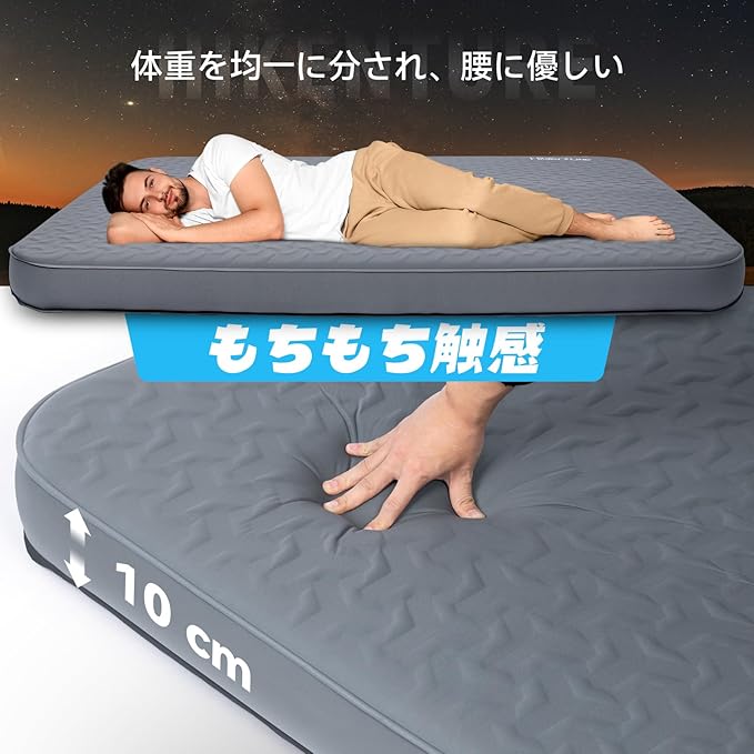 【極厚10CM・底付き感を気にせずに安眠】高密度で高反発なスポンジを採用しているため、横向きに寝た時だけでなく、インフレーターマットの上に座ってもへたりにくく、地面に触れるような「底付き感」がありません。従来なエアマットにより安定感UP、腰や体への負担を大幅に軽減します。しっかりとした支えが、体中の疲れを効果的に癒します。