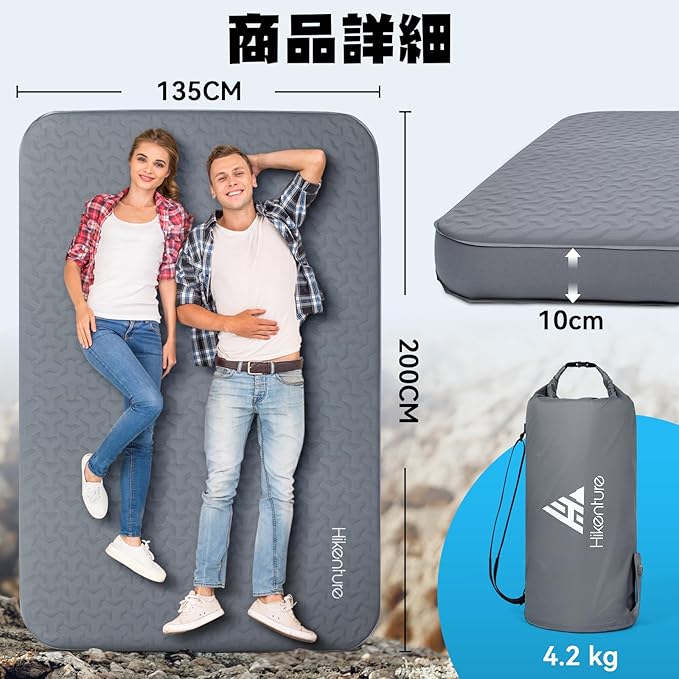 Hikentureインフレーターマット【エアバッグ付・高速設営】極厚10CM底付き感なし 自動膨張 従来より軽量・コンパクト 静音 耐水加工 登山 キャンプ 車中泊 ツーリング アウトドア用 いろんなシーンに合わせる | KAZESHOP