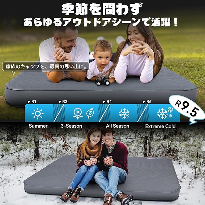 【一台あれば、あらゆるシーンで重宝】軽量コンパクトなので、ソロキャンプやファミリーキャンプはもちろん、車中泊マットとしても大活躍。さらに、急な来客時の追加ベッドや、防災マットの備蓄品としても重宝します。いつでも、どこでも、快適な休息を提供するアイテムです。