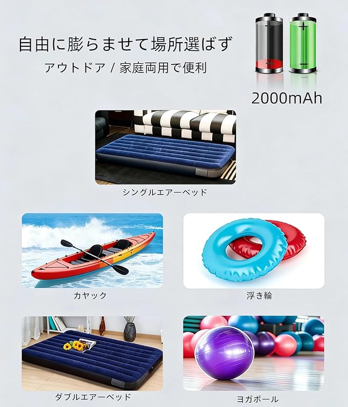 【空気入れ・空気抜き 1台2役】 強力な送風・吸引機能を搭載し、エアマット、浮き輪、真空収納袋など幅広い用途に対応します。最大5kPaのパワーで手動より圧倒的に早く、空気入れ作業を短時間で完了。アウトドア・旅行・防災用途までこれ一台で完結します。