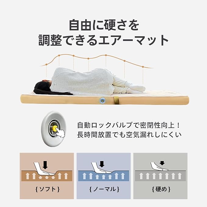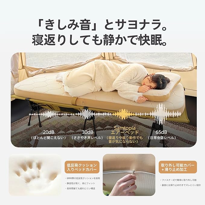 【Samtopiaの強みーー革新的なドロップステッチ生地】Samtopiaエアーベッドの最大の特長は、弊社に独自開発したドロップステッチ生地を採用していることです。上下の生地を無数の糸でしっかり結びつけることで圧倒的な耐久性と安定感を実現し、エアーベッドとは思えない快適さを提供します。空気量を調整すれば自分好みの硬さに仕上げることができ、背骨の自然なカーブをサポートしながら体圧を分散。腰への負担を大幅に軽減し、自宅のマットレスのような眠りをアウトドアでも体験できます。