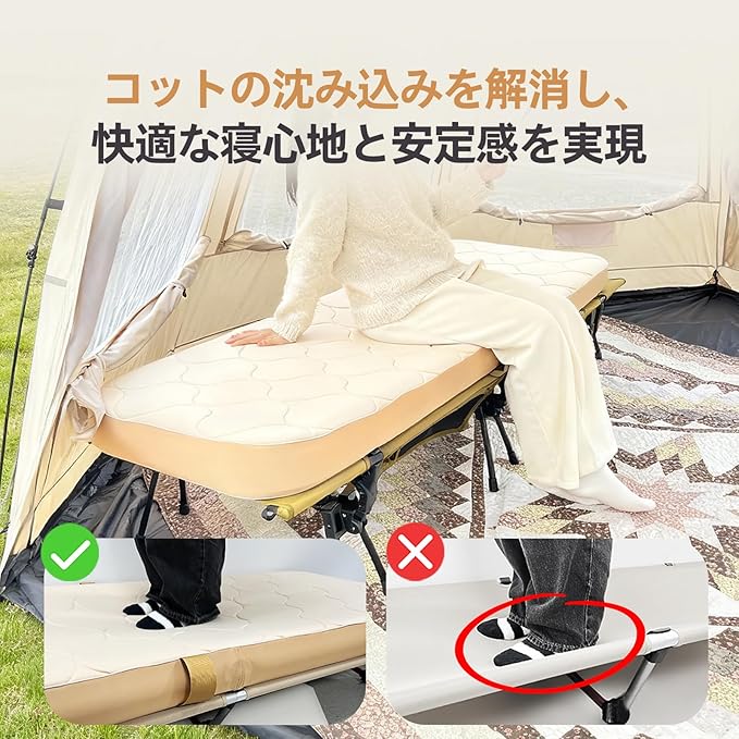 【マイナス30℃対応の高耐久TPU素材】素材には高品質TPUを採用しており、軽量で柔らかく、それでいて驚くほど頑丈です。-30℃の厳しい環境下でも使用でき、何千回折りたたんでもひび割れしにくい耐久性を備えています。さらに、0.8cm厚の柔らかなクッション付きベッドカバーを標準装備し、とても快適な肌触りです。アウトドアはもちろん日常使用にも最適です。