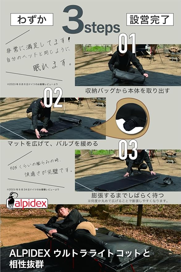 ✅【ドイツ発 欧州 人気 インフレーターマット】ゆったり大きな極厚マット。ヨーロッパで最も売れているドイツトレッキングブランドALPIDEXのインフレーターマット。2017年から6年間のロングヒットアイテム。