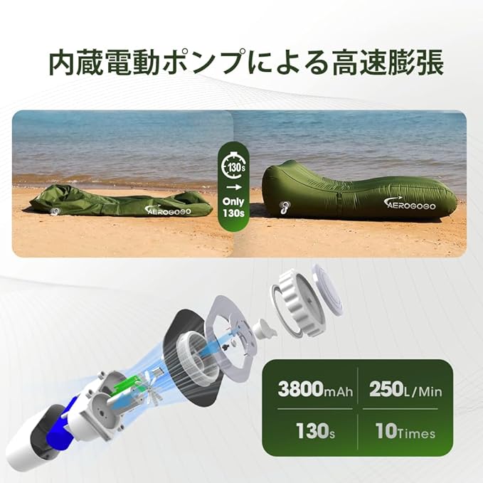 【内蔵ポンプと高速膨張】このインフレータブルラウンジャーには、統合された電動エアポンプが付いています。第2世代のAerogogoエアポンプは、50,000 RPMの高速モーターを搭載しており、4kPaの高圧力と225L/分の流量を実現します。これにより、エアソファチェアはわずか130秒で素早く膨らみ、高い効率性を誇ります。