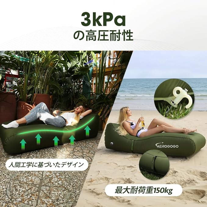【3kPaの高圧力と人間工学に基づいたデザイン】インフレータブルラウンジャーは、最大3kPaの高圧力を提供し、安定した体のサポートを確保します。これにより、エアソファチェアは安定して揺れることがありません。ポータブルハンモックの幅は80cmに拡大されており、さまざまな寝姿勢に対して安心感を提供します。背面の曲線デザインは最大限の快適さと効果的なサポートを提供します。絶対的な静けさと快適さをお楽しみください。