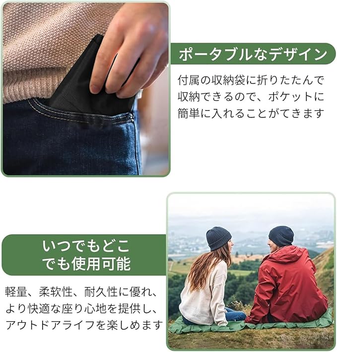 折りたたみクッションマットの新基準!花型立体構造が体圧を360度分散させ、登山クッションとして90kgまで耐える高耐久設計。 厚さ5cmのクッション 折りたたみ/折り畳み機構で、コンパクトに収納できる持ち運びクッションに変身。 通気性メッシュが熱こもりを解消し、キャンプ場から山頂まで、折りたたみクッション アウトドア使用時の蒸れストレスを軽減。 ポータブルクッション 折りたたみ仕様だからバックパックの隙間にもスッキリ収納、いつでも快適な「移動式座空間」を実現します。 「エアークッション 座布団」技術が生んだ2人用万能ツール,キャンプ クッション 座布団とアウトドア用エアーマットの機能を融合! 折り畳み座布団がレジャーシート コンパクト 2人用サイズに進化し、40Dナイロン+TPU防水層が雨の花火大会や湿った登山道でも耐久性を発揮。 クッション折りたたみ機構でポータブル座布団としてバッグ内で超省スペース化。座布団 キャンプ用途はもちろん、スタジアムや釣り場での「高反発座り革命」を実現。 耐摩耗性 通気性の絶妙バランスが、あらゆるアウトドアイベントの座り疲れを遮断します。