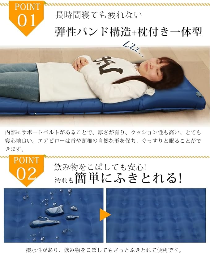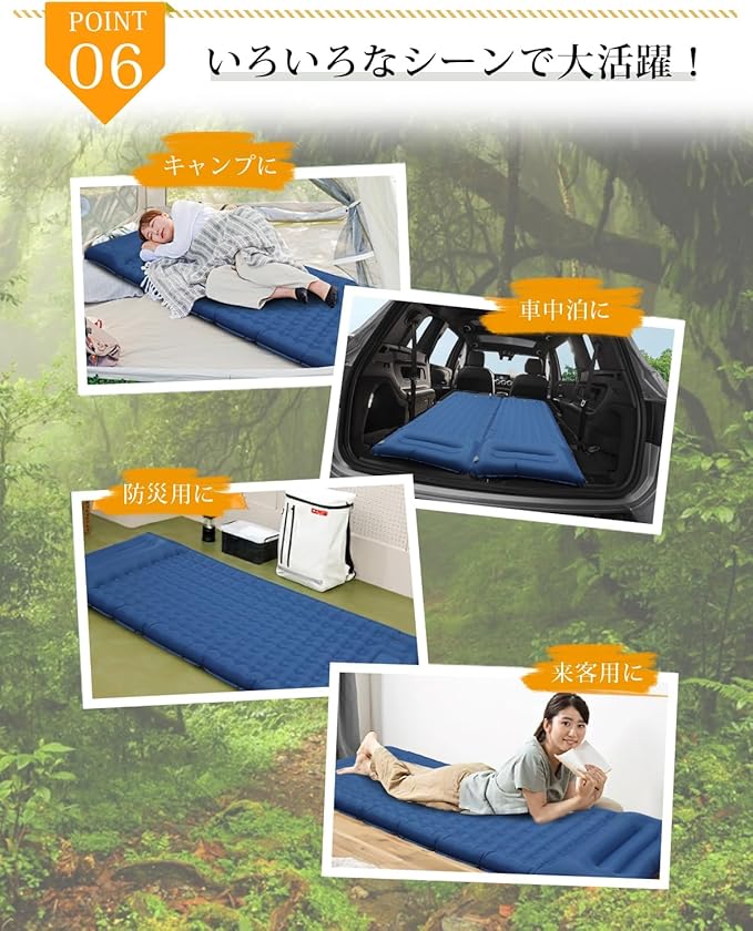 【優れた気密性&耐久性・複数連結可能】エアーマットが丈夫なポリエステル、40Dナイロン素材を採用され、多層構造で破損しにくく、気密性や耐久性に優れた。また、内部にサポートベルトがあることで、エアーマット全体に安定感があり、形崩れしにくく、沈み込むこともありません。本製品はポリエステル製で、表面に微妙な凹凸のある滑り止め加工が施されているため、体感的には滑らかな感じはしません。防水性と撥水性に優れたTPU生地を採用!汚れに強く、水に濡らしたタオル等でサッとひと拭きでОK。エアクッションの両側には接続ボタンが付いており、ボタンを閉じるだけで、また、複数のマットを連結することで、横幅を広げられ、ファミリーキャンプや車中泊に最適です。