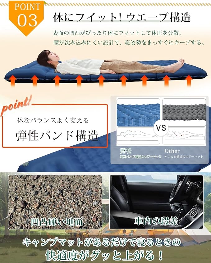 【高弾性バンド構造・極上の快適さ・枕一体式寝心地よい!】エアーマットのサイズは長さ191cm 幅65cm 高さ12cm(約)、十分な厚みがあって凸凹が少ないタイプは、まんベんなく空気が行き 渡っているので、地面の硬さをほとんど感じません。アウトドアとは思えない寝心地で快適な睡眠を堪能できます。体にフィット!高弾性バンド構造。表面の凹凸がぴったり体にフィットして体圧を分散。腰が沈み込みにくい設計で、寝姿勢をまっすぐにキープする。 枕一体式で枕の必要がなく、アーチデザインが体の形に合わせて程よくフィット。快適な寝心地で、アウトドア・車中泊に大活躍。そして、191cm長さで子供から大柄の男性までも安心して横たわれます。今日の疲れ解消し、明日のキャンプに思いっきり楽しめます。
