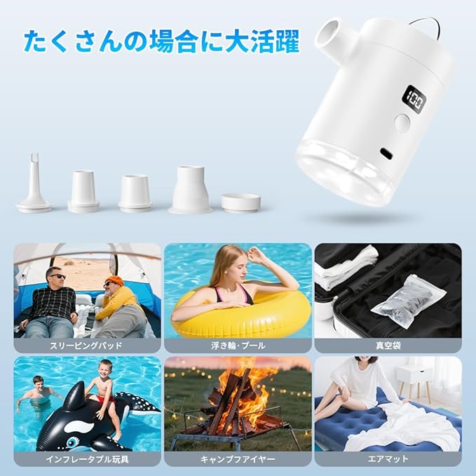 【素早く膨張/収縮&多用途5つのノズル付き】ハイパワー風力設計で、通常の電動空気入れよりも約2倍高速で、15分の使用時間で10個以上のキャンプ用エアーベッドを膨らませ、数十個の収納バッグを圧縮することができます。また、5種類のアタッチメントが付属しており、キャンプ用のインフレーターマットやエアークッションの充気はもとより、BBQの火起こし送風、夏の浮き輪の膨らましなど、幅広い用途で大活躍。シリコン製のアタッチメントは伸縮性が高く、サイズに多少の誤差があっても問題なく使用できます。日常使いはもちろん、災害時の備えとして非常用袋に入れておくと、万一のときにも役立ちます。 ライトの使用方法:二回リックして、ランプが点灯;一回リックして、二段階の明るさを調整;また、二回リックして、ランプが滅灯!