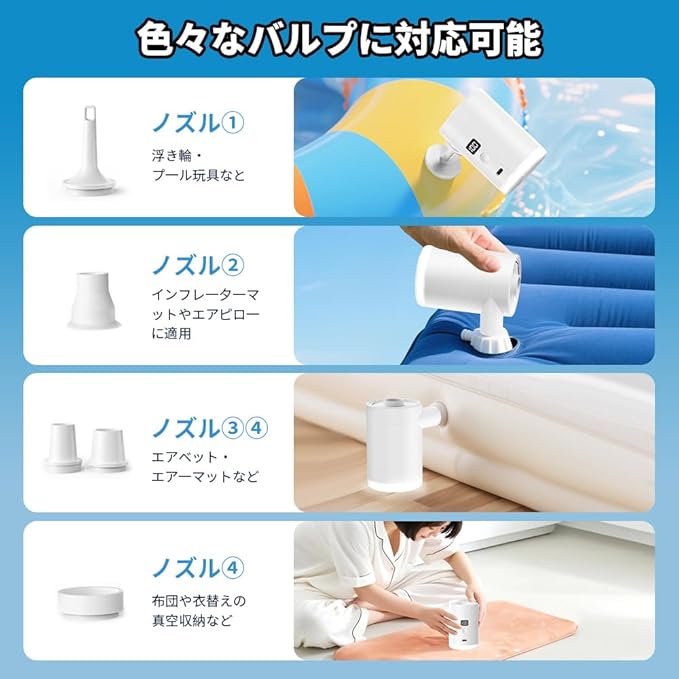 【空気入れ&空気抜き 両対応】風密度450L/分と強力で、5000paの空気入れる圧力と4000pa空気抜く圧力により、エアマットレスを素早く空気入れることができます。 キャンプ、アウトドアでこれがあれば準備が楽ちんです。また、ノズルを付け替えることで、迅速に圧縮袋の空気を抜いて、収納スペースを50%以上節約でき、アウトドア用品や衣類を保管するために多くの時間とスペースを節約することを実現できます。 ライトの使用方法:二回リックして、ランプが点灯;一回リックして、二段階の明るさを調整;また、二回リックして、ランプが滅灯!