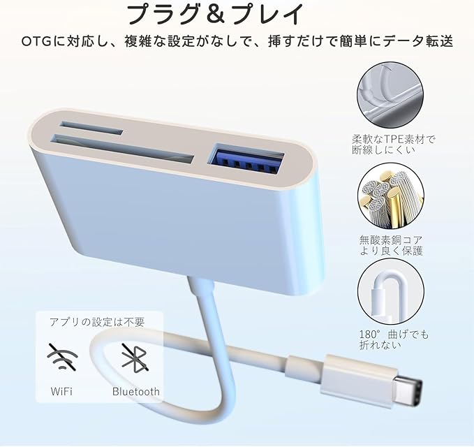 【OTG機能・プラグ&プレイ】スマホとUSB機器をダイレクトにつなぐ「USB OTG」機能が搭載で、PCなしでも、挿すだけでスマホやタブレットなどのUSB Cデバイスが直接にメモリカードにあるデータにアクセスすることができます。専用アプリやインターネット不要でデータ通信制限を気にすることなく、カードリーダーを接続するだけで、簡単にデジタルカメラで撮影した写真をTypeC スマホに転送できます。▲お使いのUSB CスマートフォンがOTG機能に対応しているか確認お願いします。