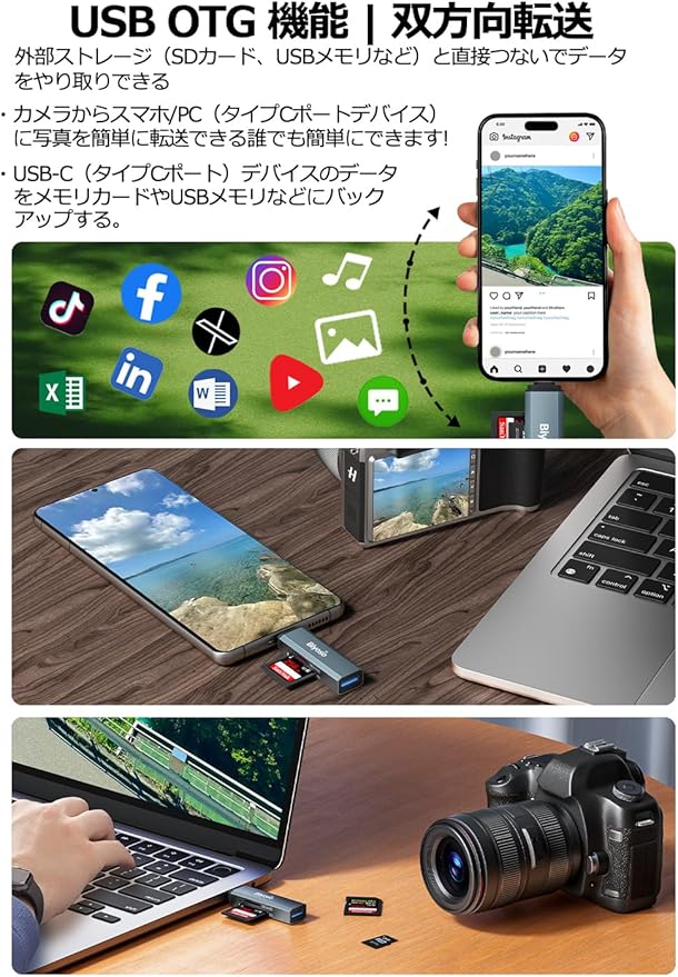【幅広い互換性】USB/SD/マイクロsdカードリーダーは、Windows、Mac OS、Linux、AndroidなどType-Cポート搭載したコンピューター、スマホ、タブレットに対応します。USB-Cポートを備えたiPhone17/iPad Pro/MacBook Pro Air/Dell/HP/Galaxy/xiaomiなどに対応します。写真、動画、音楽はもちろん、ExcelやPDFなどの書類データも転送可能です。