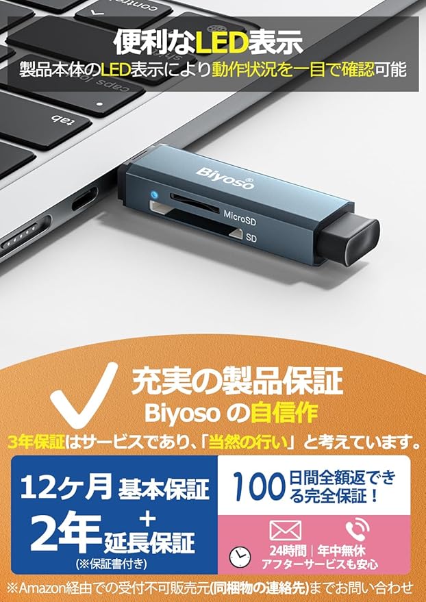 【信頼できる3年品質保証】当社のsdカードリーダー タイプc製品には36ヶ月の保証が付いています。お客様にお届けするUSB-C sdカードリーダー はすべて丁寧に検査されており、詳細な日本語説明書が付いておりますので、ご不明な点がございましたらお気軽にお問い合わせくださ。