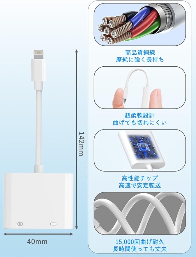 【軽量・持ち運び便利】たった約12.4gの超軽量ボディで、ポケットやカバンにすっきり収納可能。柔軟で断線しにくいTPU素材を採用し、日常使用はもちろん、旅行や出張にもぴったり。使いやすさと耐久性を兼ね備えたLightning sdカードリーダーです。