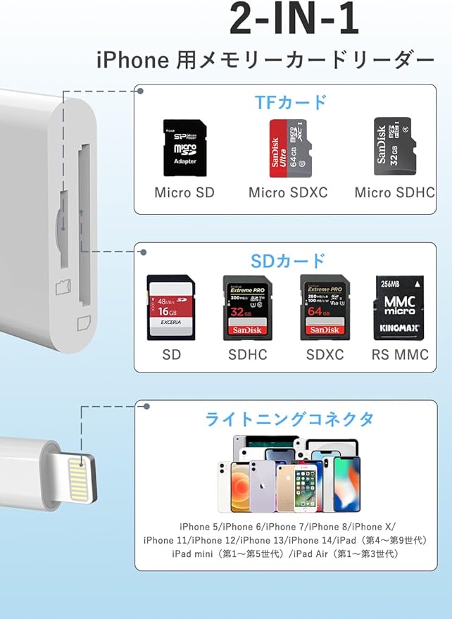 【広い互換性・iPhone/iPad対応】iPhone 14/13/12/11/X/XS/XRシリーズおよびLightning端子を搭載したiPadに対応(※Type-C端子の機種は非対応)。iPad用カードリーダーとしても活躍し、写真や仕事用ファイルの整理・管理がより快適になります。