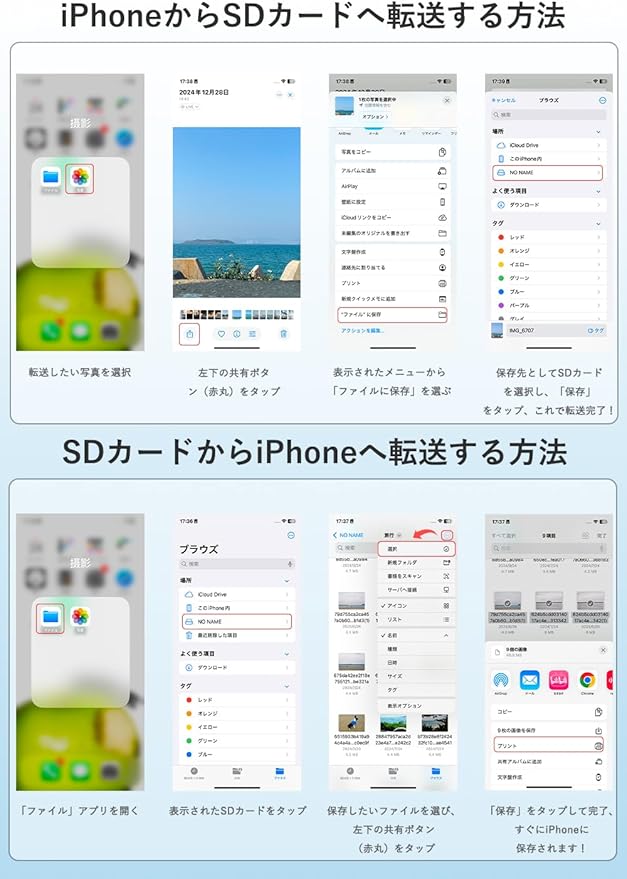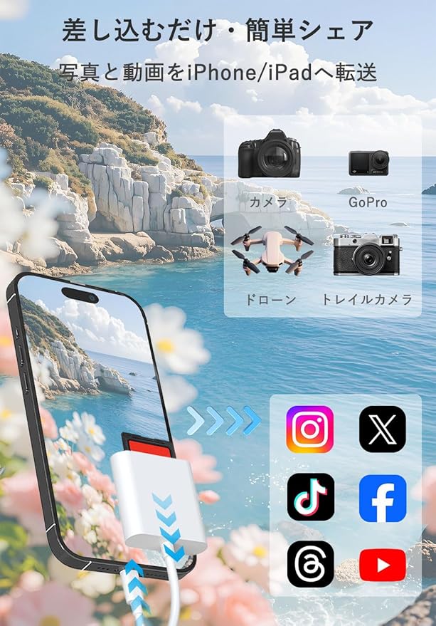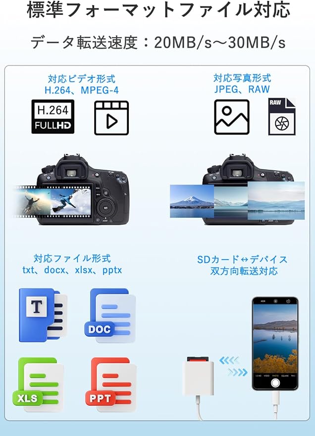 【アプリ不要・簡単操作】差し込むだけですぐに使えるプラグ&プレイ設計。専用アプリや複雑な設定は一切不要で、初心者の方でも迷わず操作できます。iPhoneからsdカードへの写真移動や、動画・画像の共有、自宅でのデータバックアップなどもスムーズに対応します。