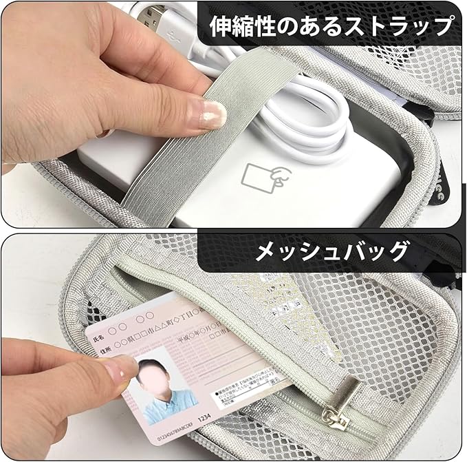 すっきり収納システム: 内側の彈性バンドでリーダー本体をがっちり固定し、振動や衝撃から守ります。上部のメッシュポケットには、マイナンバーカード、IC運転免許証などの各種カードや、SIMカードピン、USBケーブルなどの小物を分けて収納。紛失防止と整理整頓に最適です
