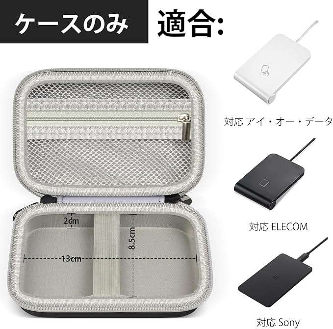 幅広い互換性: 内寸13 8.5 2cmのコンパクト設計で、対応IODATA USB-NFC4/E、対応ELECOM MR-ICA001BK、対応ソニー PaSoRi RC-S300/S1をはじめ、同サイズの多くの非接触型ICカードリーダーライターにご使用いただけます。専用ケースを探す手間が省け、業務用・個人用を問わずお勧めです