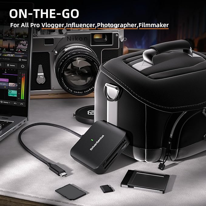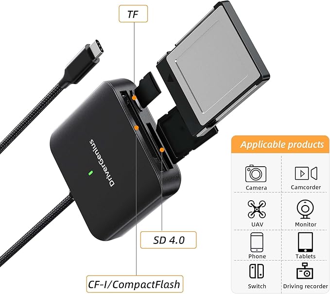 CFast2.0対応トライコネクトカードリーダー(HB081): DriverGenius HB081は、CFast2.0、microSD4.0、SD4.0の3スロットを備え、さまざまなメモリーカードにアクセス可能です。CFast2.0、UHS-II SD、microSD4.0に対応したDSLRカメラユーザー向けに設計され、高性能カードからの高速ファイル転送やバックアップを可能にし、写真や映像制作のワークフローを効率化します