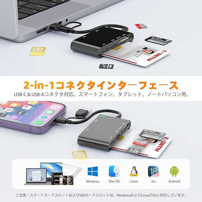 【2-IN-1コネクタ設計】SDカードリーダアダプタは複数インターフェースを搭載。USB/Type-Cコネクタ、iPhone 16/16Pro/15用Type-Cコネクタ、Samsung Galaxy S24/S23/S22/S20/S10/Note 9/8、 LG G5 G6 V20、Chromebook、Google Pixel、Google Nexus 5X 6P、Huaweiに対応。USBコネクタはMac OS、Windows XP/Vista/7/8/8.1/10などに対応。MacBook Pro、MacBook Air、Surface Pro、Dell、HPなどのPCでご利用いただけます。