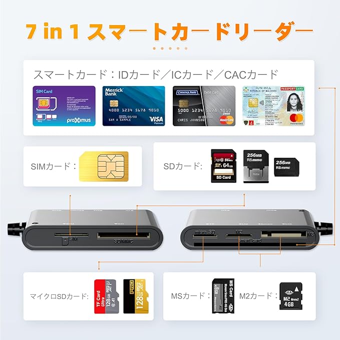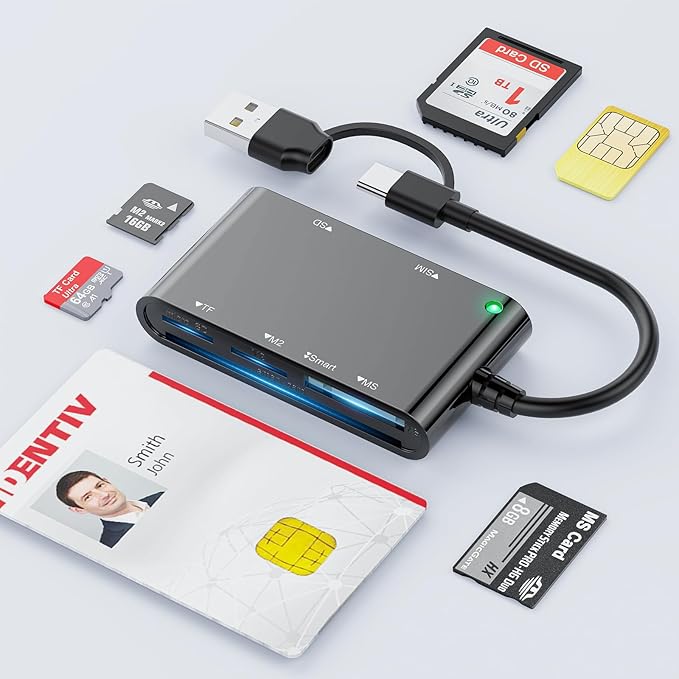 【6-IN-2マルチカードリーダー】PC/カメラ用USBメモリリーダー:6つのカードスロットを備えたUSBカードリーダーハブ。スマートカードタイプ対応 - 5V、3V、1.8Vスマートカード、ISO 7816クラスA、B、C。対応メモリカード:SDXC/SDHC/SD/Extreme I III SD/Ultra II SD/MS/M2/MMC/RS-MMC、TF/Micro SD/Micro SDXC/Micro SDHC/UHS-I/SIMカードリーダー。注:SIMスロットは標準SIMサイズです。マイクロSIMおよびナノSIMには別途アダプターが必要です。