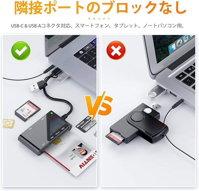 【スリム&コンパクト】コンパクトなUSBカードリーダーは旅行に最適なキットです。強化USB 2.0ケーブル、錫メッキ純銅芯と多重シールド構造、頑丈な外装と耐熱コネクタにより、高いデータ転送効率と究極の耐久性を実現。5.1インチの短いケーブルテールはPCのUSBポートへの負担を軽減し、隣接ポートの使用にも影響しません。