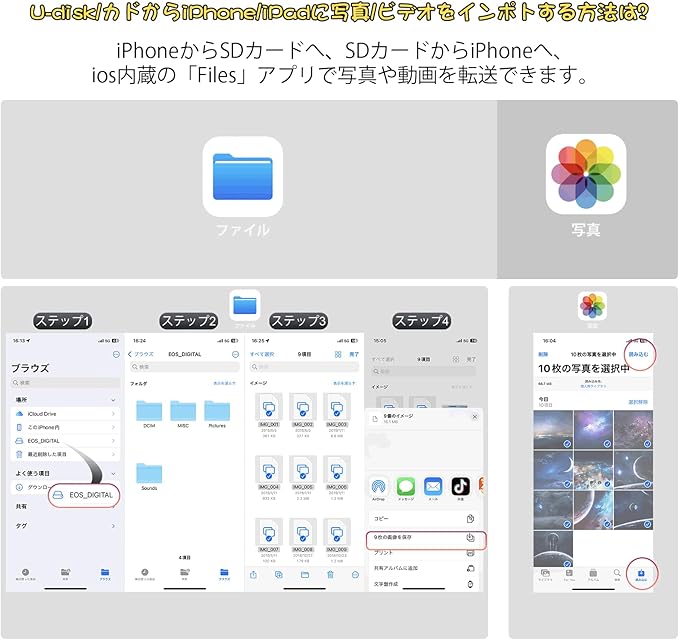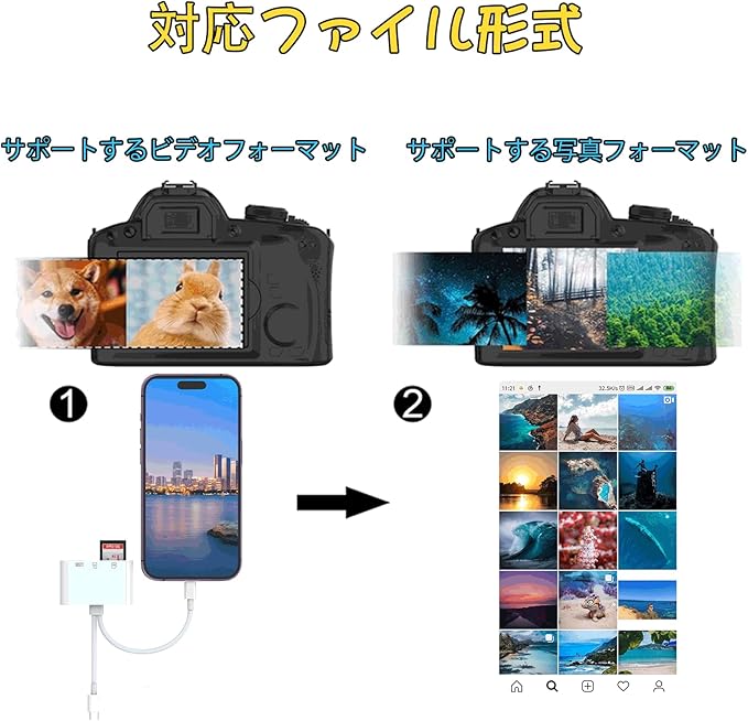 ✅【Lightning+Type-Cデュアルポート-幅広い互換性】このライトニング sdカードリーダーには、USBCとLightningのデュアル出力ポートが装備されており、通常のカードリーダーよりも互換性が50%向上している。iPhone 15Pro Max/iPhone 15 Pro/iPhone 15 Plus/iPhone 15/iPhone14ProMax/13/12ProMax/12Pro/12/11/Xs/8/7/6/5/5S/SEおよびiPadAir/Mini/Pro用。MacBook Pro 2022/2021/2020/2019/2018/2017/2016、Surface、Samsung Galaxy、HTC U11/U12、Pixelbookに対応。 、Dell XPS 15 / XPS 13、Galaxy Book、およびその他の多くの USB-C デバイス。タブレットからusbアダプタまで標準の写真フォーマットやJPER、RAW、SD、hdビデオフォーマットに対応しています。カメラ、マウス、キーボード、USBメモリ、カードリーダーなど、USB周辺機器を接続することもできます。