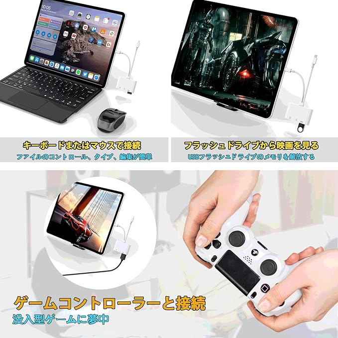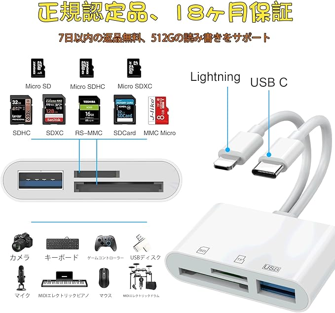 特徴 Lightning+USB C, MFI認証, プラグ&プレイ, 読み書き同時, 高速伝送