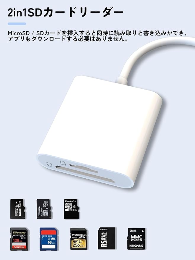 【2in1 SDカードリーダー・MFI認証】この2in1SD カードリーダーはMicroSD / SD/TFを対応します。SDカードを挿入すると同時に読み取りと書き込みができ、面倒な抜き差しはない、アプリもダウンロードする必要はありません。