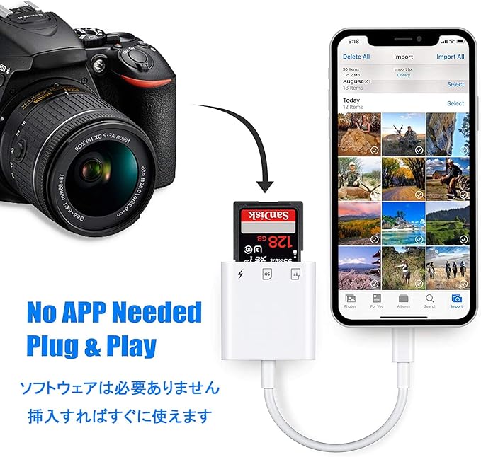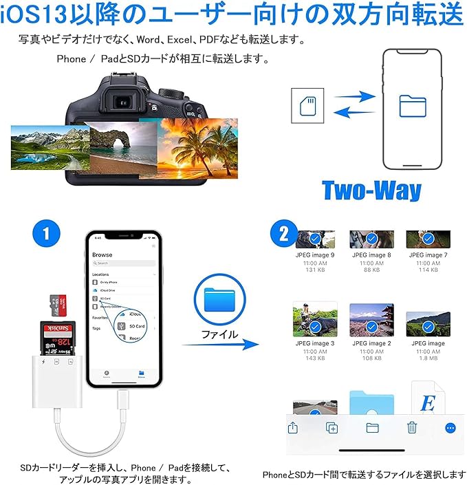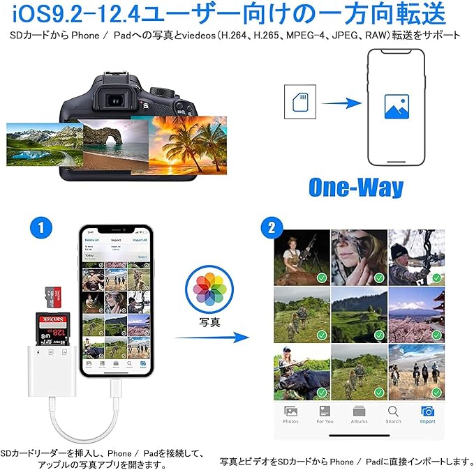 ✔【高速データ転送で効率アップ】 転送速度は最大14MB/s~16MB/sに達し、写真やビデオを素早くスマートフォンやタブレットに転送可能です。短時間で大量のデータを移行できるため、写真やビデオ編集を楽しむ方や旅行好きにとって理想的なアイテムです。iOS14以降では双方向データ転送にも対応しています。