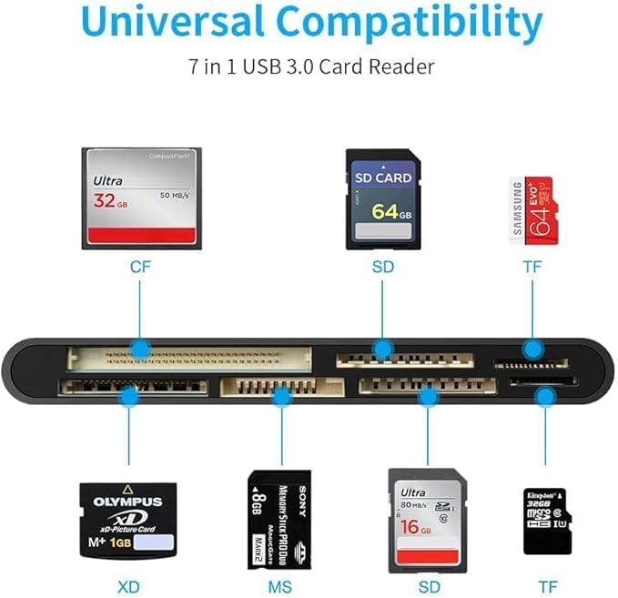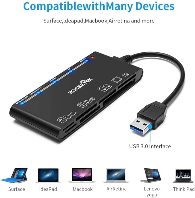 【7-in-1 メモリーカードリーダー】Rocketek USB 3.0 カードリーダーは5種類のカードへの同時読み書きが可能。カードの抜き差しの手間を省き、作業効率を大幅に向上させます。