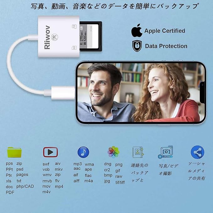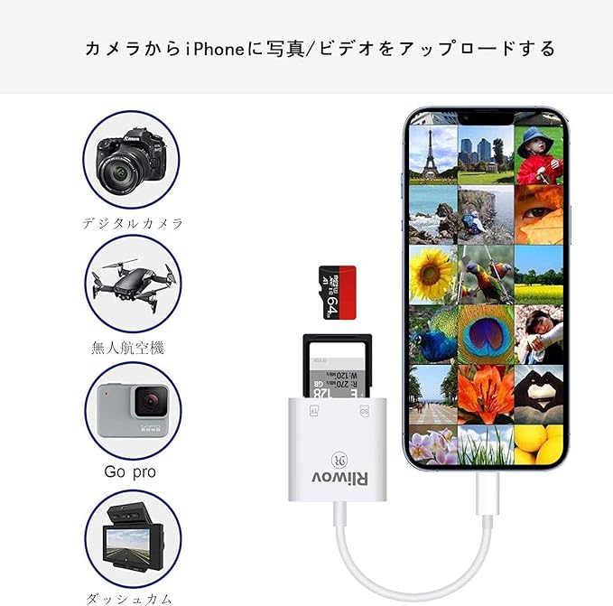 【2in1 SDカードリーダー】 当社のブランドRliwovは、アップル認定パーティ、モデル/ SKU:Rliwov-001、PPID:261677-460217です。このiPhone/iPad 用 SD カードリーダーアダプターは、SDカードからiPhoneやiPadに直接写真や動画をダウンロードし、14MB/S~16MB/Sの高輸送速度、短時間でSDカードから写真や動画をiPhone/iPadに直接読み取りできます、いつでもどこでも友人や親戚とビデオや写真を共有できます。