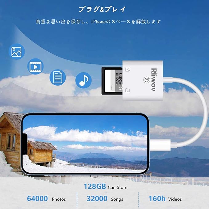 【暗号化機能&自動バックアップ】 外付けドライブを接続し、「Rliwov space」アプリをダウンロードして。接続しても認識できない場合はapp storeから「Rliwov space」をダウンロード。アプリのインストールでは、カードリーダーのパスワードを設定し、必要なデータを暗号化できます。iPhone用ファイルロックを使えば、紛失してもデータ漏洩の心配がありません。大量の写真やビデオは、ワンクリックバックアップ機能によってiPhoneからこのカードリーダーに簡単に転送されます。海外や旅行で好きなだけ写真を撮ることができます。保存した写真や動画はどこでも簡単に閲覧。