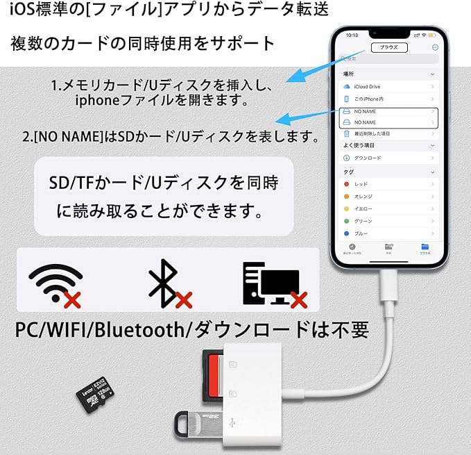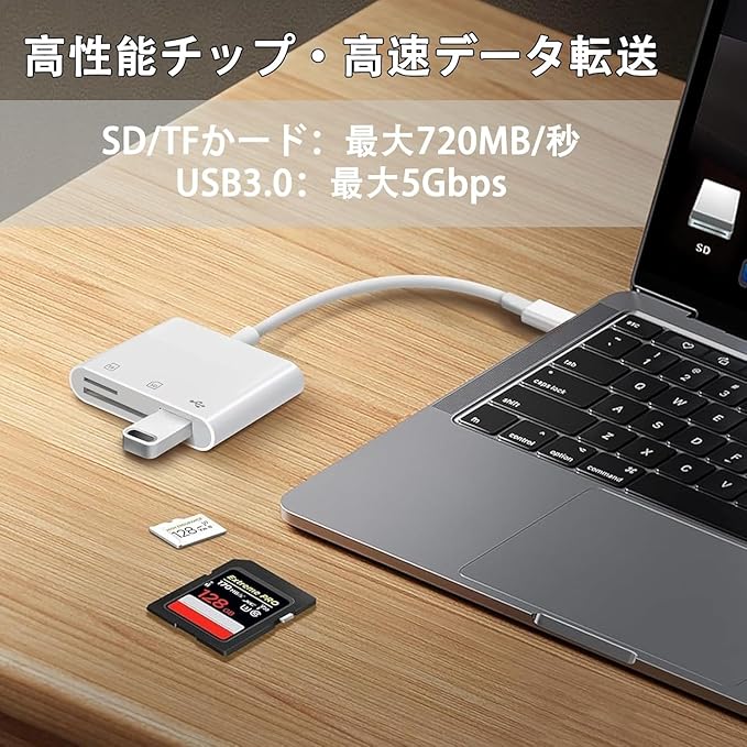 【高速データ転送・双方向】SDカードリーダーは新世代チップを採用したデータケーブルリーダーで、超高速データ転送に対応すると同時に、接続機器を安全かつ安定に保ちます。双方向伝送により、iPhoneとSD/TFカード、USBデバイス間のファイル転送もスムーズに行えます。