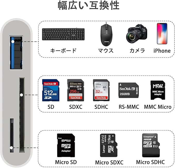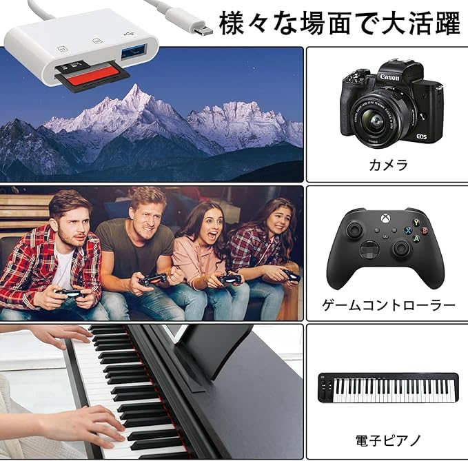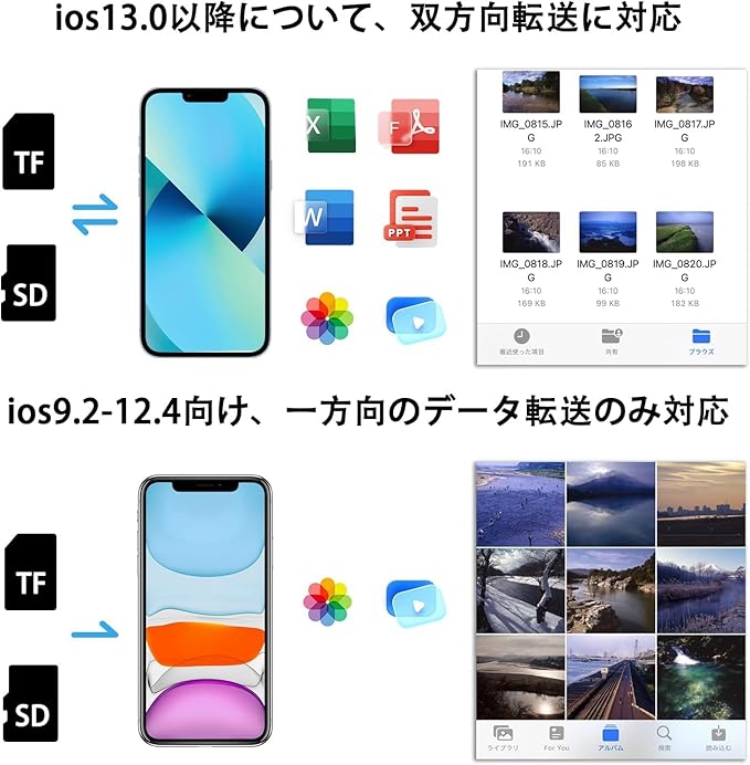 【マルチデバイス対応】iPhone14ProMax/14Pro/14Plus/13/13Pro/13ProMax/12ProMax/12Pro/12/11/Xs/8/7/6/5/5S/SEおよびiPadAir/Mini/Pro用。タブレットからusbアダプタまで標準の写真フォーマットやJPER、RAW、SD、hdビデオフォーマットに対応していて、最高でiOS26まで対応することができます。