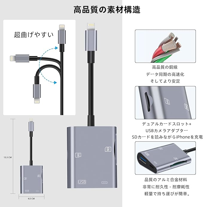 【急速充電】充電ポートを搭載し、ライトニング sdカードリーダーを使用中に急いで充電することができます。データ転送中も端末の電池残量を気にする必要はありません。ケーブルには無酸素銅・アルミ箔などを組み込んだ4芯銅線を採用、過熱やショートへの多重保護機能をもち。