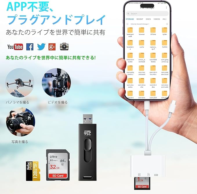 【双方向高速転送】iOS 13 - 16デバイスに適した双方向転送です。SD/TF/CFカードから電話/パッドにデータをインポート、または電話/パッドからSD/TF/CFカードにファイルをエクスポートします。ムービー、ミュージック、ワード、パワーポイント、エクセル、PDFなどを含む。最大512GBのSD、SDHC、SDXC、MicroSD、MicroSDXC、MicroSDHCメモリーカードに対応します。