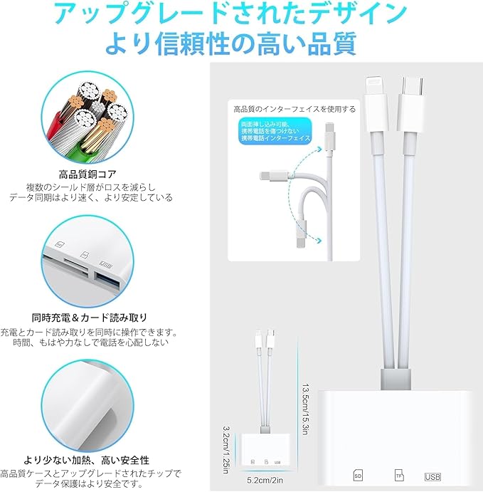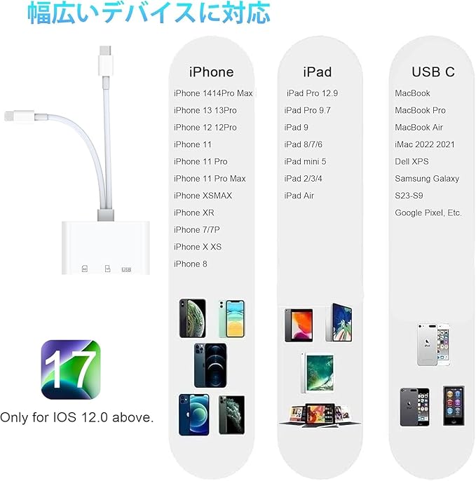 【幅広い互換性】iPhone SDカードリーダーはiOS 12.0以降のすべてのPhoneとiPadにのみ対応しています。お使いのデバイスのOSをご確認ください。Type-Cコネクタは、iPhone 15、MacBook Pro、iMac、2018年以降のMac Mini、iPad Pro 2022/2021/2020、iPad Air 2020/2022、Surface Book、Surface Go、Moto、Samsung Galaxy、DJIなどのUSB-Cデバイスなど、Type-C/USB-Cポートを備えたAndroid携帯電話/コンピュータのOTGをサポートします。