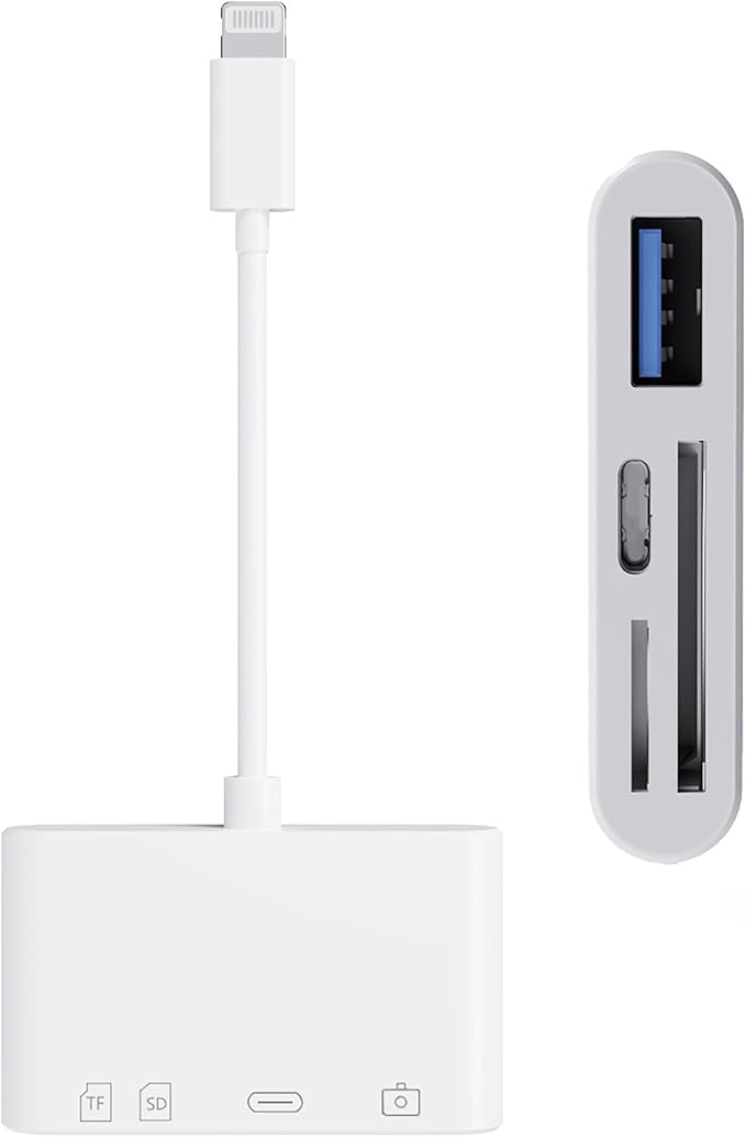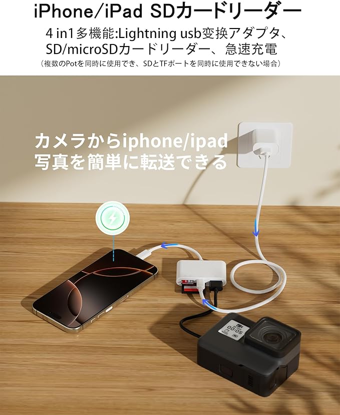 【4in1多機能】 Lightning usb変換アダ夕、SD/microSDカ-ドカ-ドリ-ダ-、急速充電、OTG アダプター。複数のポ-トを同時に使用可能,注意: SDスロットとTFスロットは同時に使用できません。