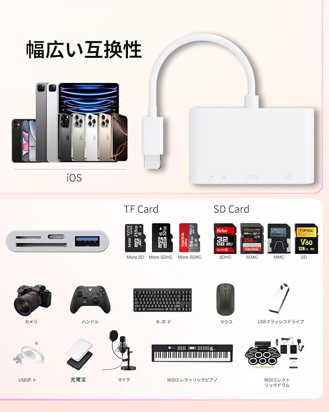【幅広い互換性】SDカード、Micro SDカード、カメラに加えて、USBフラッシュドライブ、マウス、キーボード、ゲームコントローラー、マイクなどのUSB周辺機器も接続できます。カードスロットとUSBポートは、iPhone14ProMax/14Pro/14Plus/13/13Pro/13ProMax/12ProMax/12Pro/12/11/Xs/8/7/6/5/5S/SEとiPadAir/Mini/Proに同時に使用できます。軽量端子を搭載したあらゆるデジタルバスに対応します。 (iOS9~iOS18に対応)