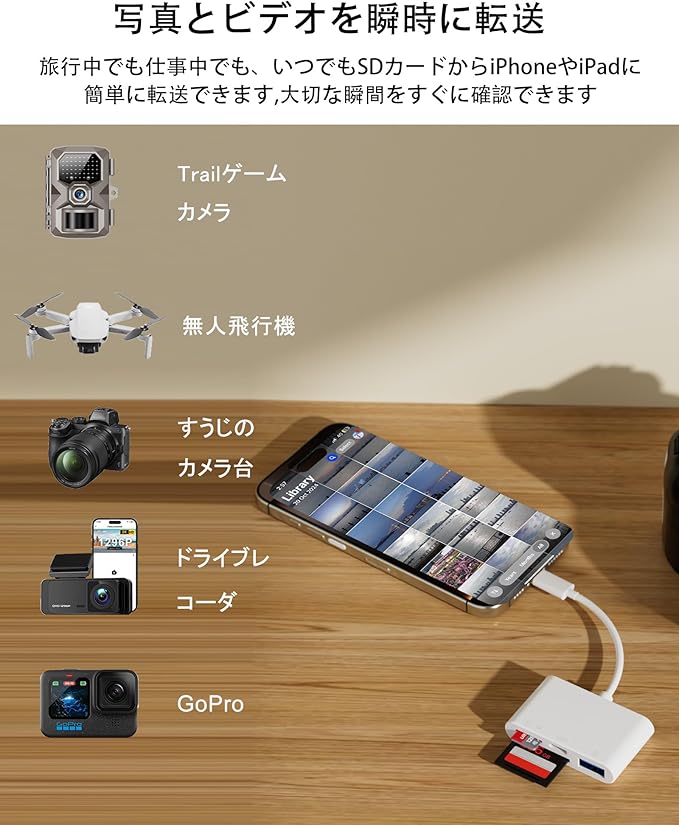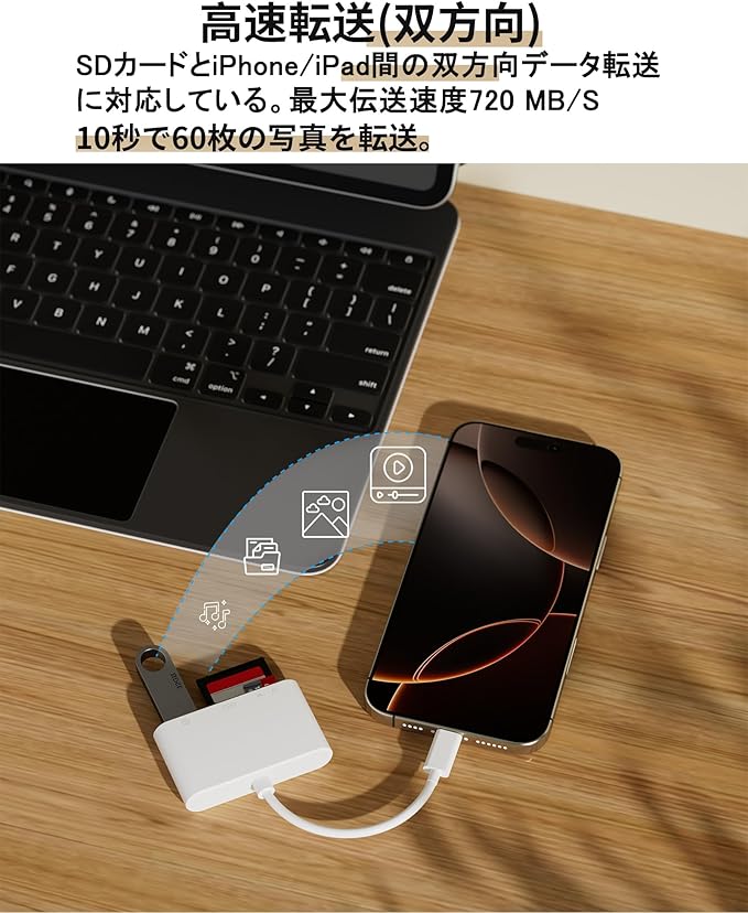 【ライトニング sdカードリーダー】iPhoneとSDカード間の高速双方向データ転送をサポートします。最大転送速度は720MB/秒で、10秒間に60枚の写真を転送できます。注意:使用時に1枚のSDカ-ドを読み取ることしかサポ-トしていないが,USBカ-ドスロットと同時に使用することができ。