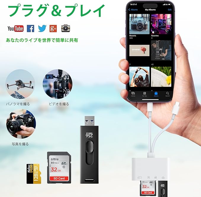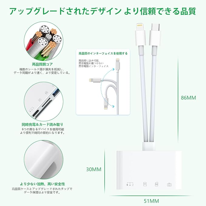 【幅広いカード互換性】このPhone/PadとUSB-Cデバイス用カードリーダーは、簡単にスピードと利便性でほとんどすべてのメモリカードを読み取ることができます。SDXC/SDHC/SD/MMC/RS-MMC/マイクロSD/TF/マイクロSDXC/マイクロSDHC/UHS-Iメモリーカードをサポートします。また、追加のUSBポートは、USBフラッシュドライブ、Uディスク、ハードドライブ、キーボード、マウス、プリンタなどで動作することができます。