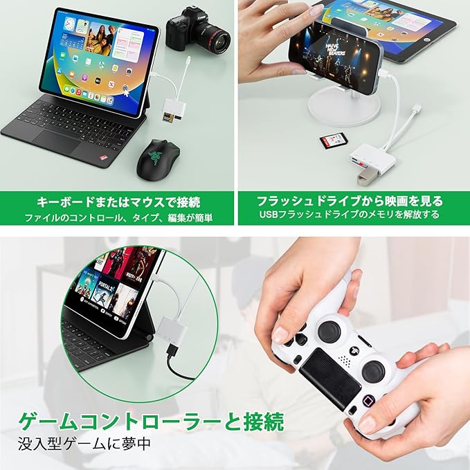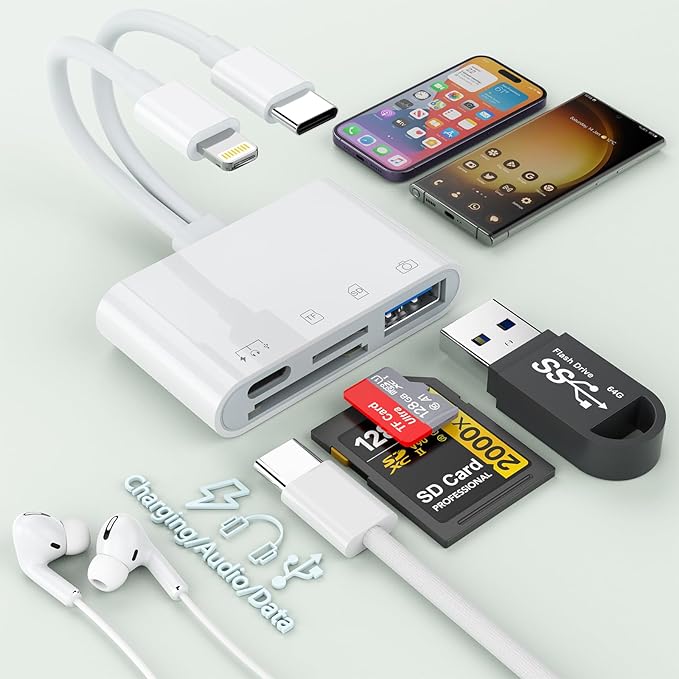 【幅広いデバイスに対応】このユニバーサルカードリーダーハブは、Phone 16/15/15Pro/14/14Pro/13/13 Pro/12/12 Pro/11/11Pro/XS /XS Max/XR/8/7, Pad4, Pad Air, Pad miniに対応します。Type-C for Samsung Galaxy S24 S23 S22 S20 S10 S9 S8 Note 9 8, LG G5 G6 V20, Google Pixel, Google Nexus 5X 6P, MacBook Air/Pro, Surface Pro 10/9/8, Huawei Mate60 Mate20, Lumia 950, Lumia 950 XL/Moto Zなど。