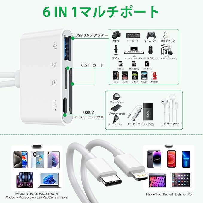 Phone Pad用SDカードリーダー 6-in-1 Lightning - USBアダプタ SD/TFカード/タイプCオーディオアダプタ/PD60W充電/USB 3.0アダプタ、Phone用メモリカードリーダー16/15/14/13/12/11、サムスンプラグアンドプレイ | KAZESHOP