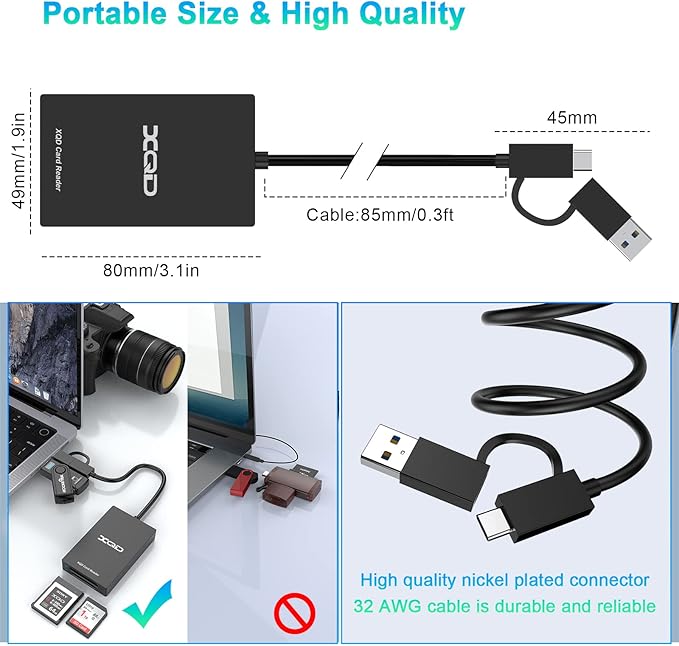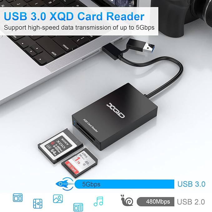 ✅【XQD USB/USB-Cプロフェッショナルカードリーダー】2つのスロットを備えたSD/XQDカードリーダーアダプターは、写真家向けに設計されています。 カードリーダーは2in1 USB-C/USB 3.0ポートを使用し、すべてのXQD/SDカードリーダーで使用できます。 XQDカードリーダーからスマートフォン/ラップトップ/コンピューターに画像や動画を便利にダウンロードし、マルチフォーマットのメモリカードとPCまたはタブレット間のユニバーサル転送ソリューションを提供します。