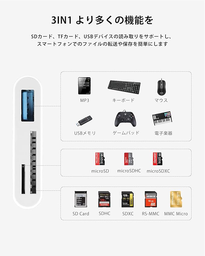 【3in1マルチカードリーダー】SDスロットとmicroSDスロットとUSBスロットを各1ポート搭載し、簡単にファイルの同期や転送、共有ができます。USBフラッシュディスク、マウス、キーボード、カードリーダー、カメラ、プリンター、ハードドライブ、その他のUSB接続デバイスなどのUSB周辺機器を接続できます。キーボードをUSB Cスマートフォンに接続し、より速いタイピングとチャットを楽しむことができます。チップもアップグレードされ、より多くの周辺機器に対応しています。
