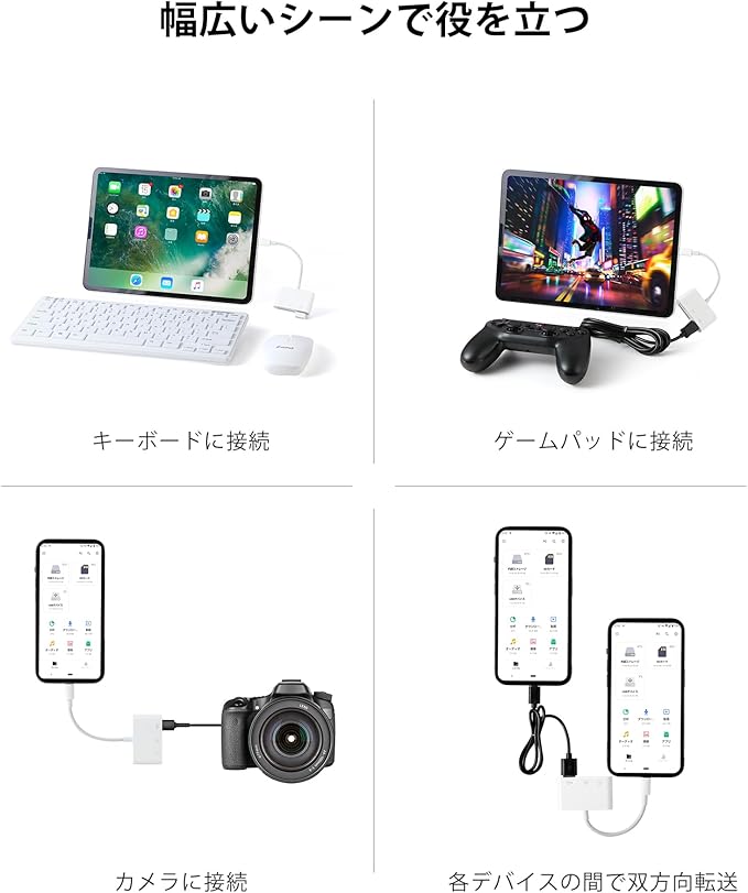 【超コンパクトで操作簡単】:専用アプリやインターネット不要でデータ通信制限を気にすることなく、カードリーダーを接続するだけで、簡単にデジタルカメラで撮影した写真をi-Phone/i-Padに転送できます。小さいなサイズで軽く、ケーブルも短く、携帯しやすい。小型&軽量なデザインで持ち運びにも便利です。ご出張中、ご旅行中、手軽にカバンに入れて楽々です、写真愛好家に最適です。