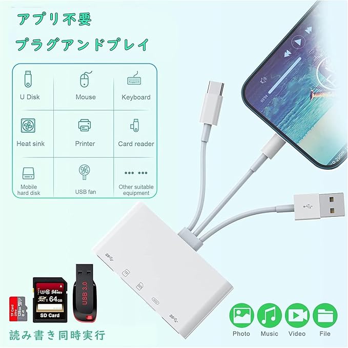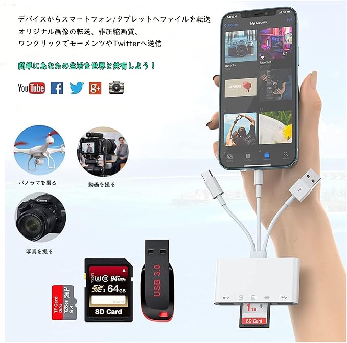 【8-in-1カードリーダー】2*USB ポート + 1*SDポート(SD /SDHC/SDXC/MMC/RS-MMC)+1*TFポート(Micro SD/Micro SDHC/Micro SDXC)1*Lightningポートが装備されています。iPhone カードリーダーを使えば、いつでもどこでもビデオや写真を共有することができ、携帯電話の容量不足や写真の多さ、外部デバイスや充電の心配もない。